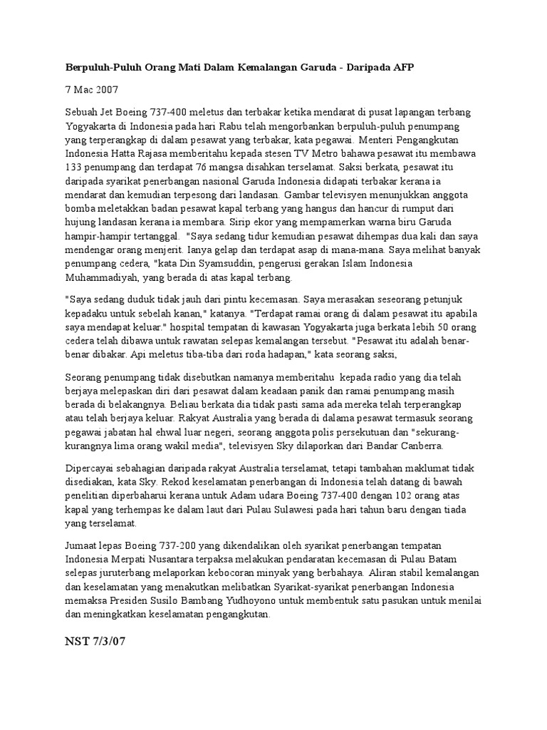 Contoh Karangan Bertajuk Kapal Terbang Terhempa